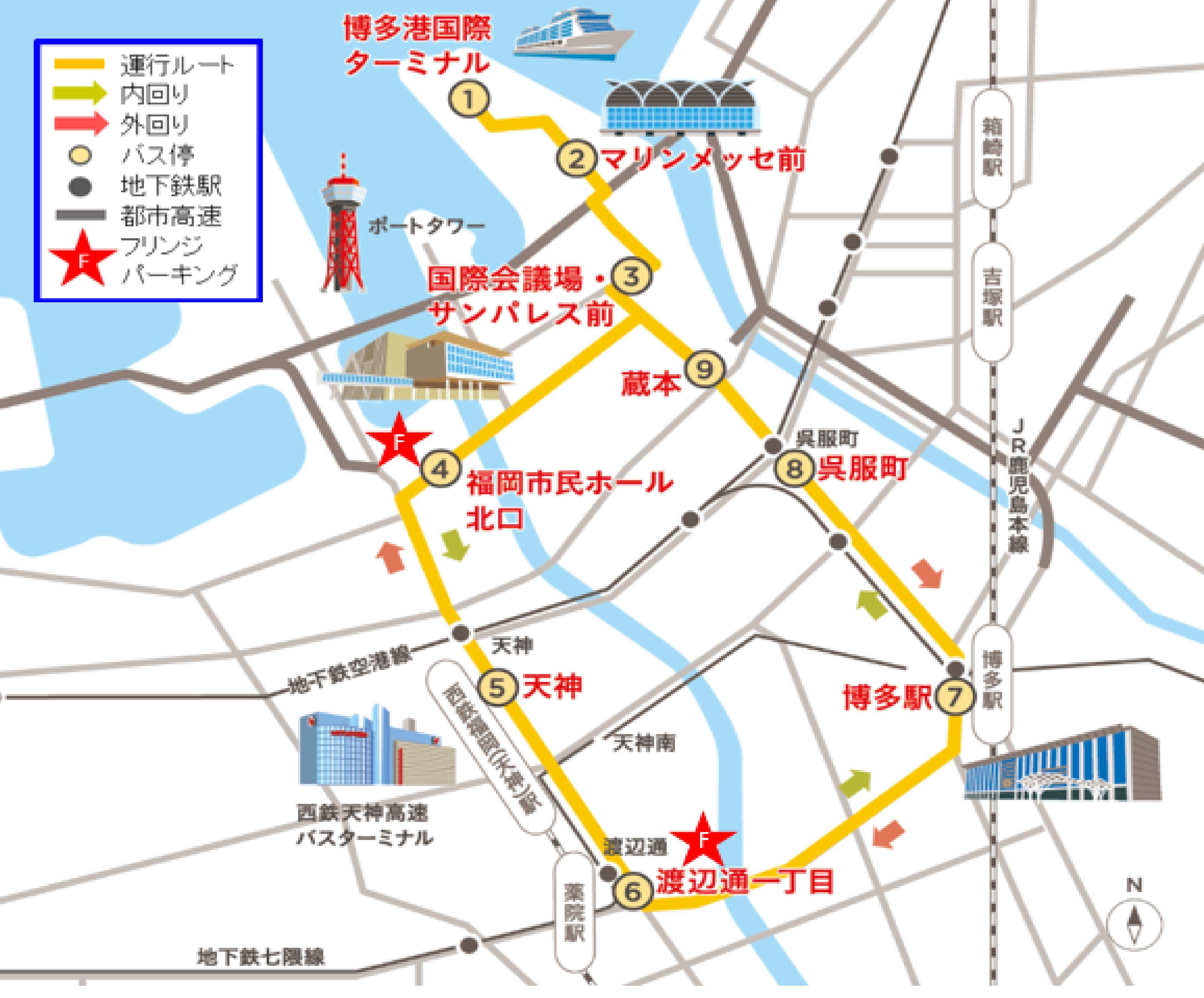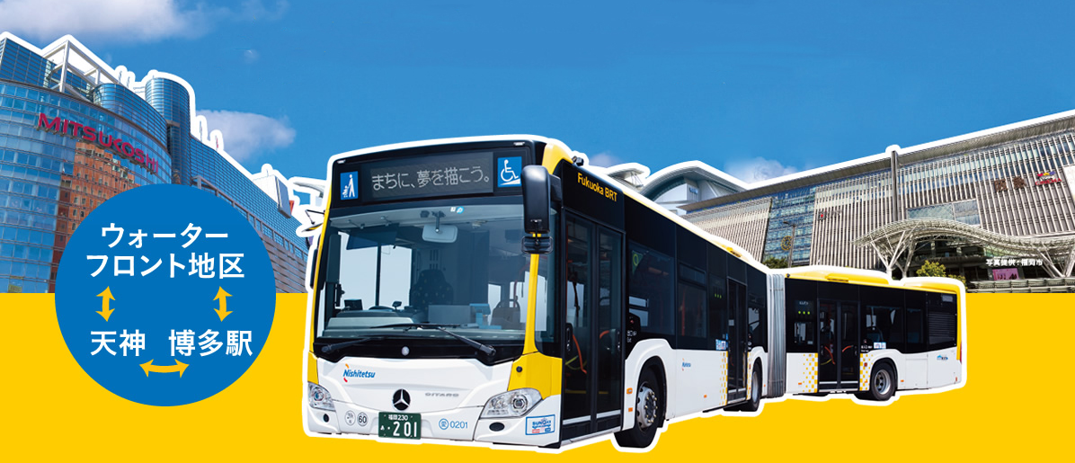 天神・博多・ウォーターフロント地区を約15分間隔で循環する路線バス。全長18m、130人乗りだから、1度に多くのお客さまが移動できるなど、町に人に快適なバスの新スタイルです。