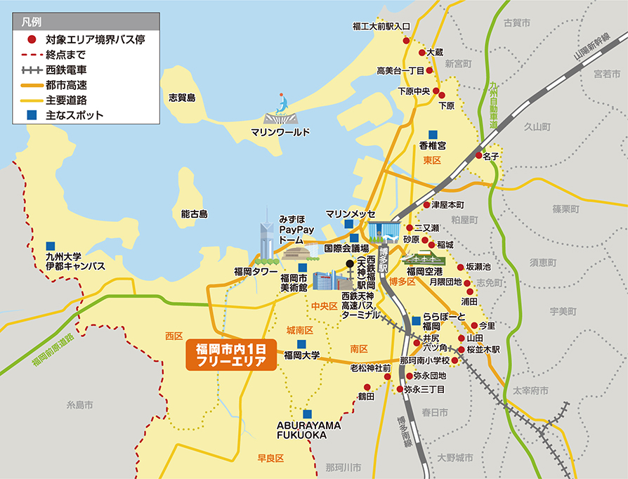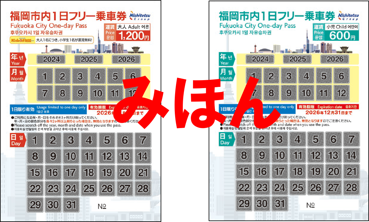 福岡市内を走る路線バスに1日何度でも乗り降りできる乗車券です。
