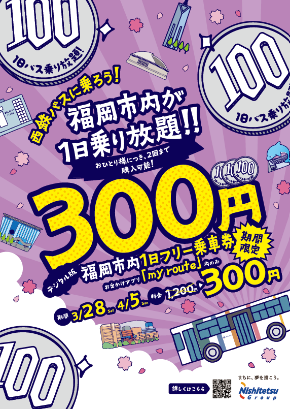 『西鉄バス 福岡市内1日フリー乗車券』を通常価格1,200円(紙券)のところ、300円で発売いたします!