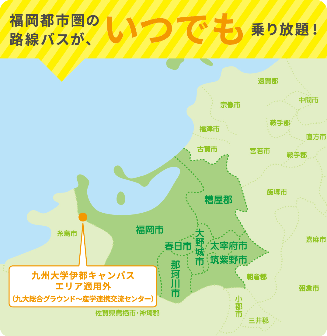 九州大学伊都キャンパスエリアを除く、福岡都市圏6市1郡(福岡市、春日市、大野城市、太宰府市、筑紫野市、那珂川市、糟屋郡)を運行する西鉄、西鉄グループの一般路線バス全線