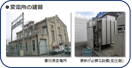 最も古い春日原変電所は築100年を超え、老朽化しているため建替を実施するほか、その他の変電所も更新を進めていきます。