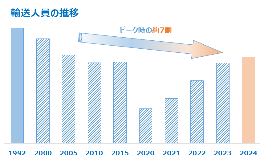 輸送人員は、沿線の少子高齢化やマイカー移行等により、1992年度をピークに減少傾向で、2024年度はピーク時の約7割となっています。